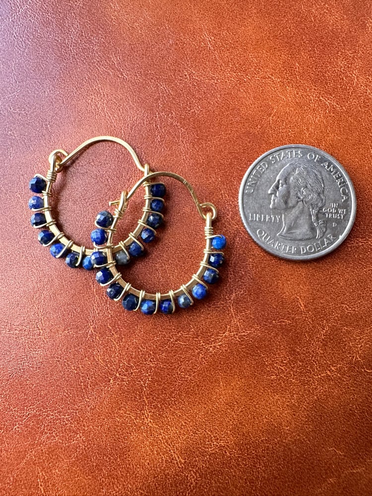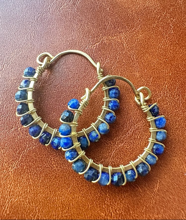 Each Azura hoop is individually wire-wrapped and hand-hammered in your choice of sterling silver, brass, or copper, making every piece a one-of-a-kind wearable talisman. The deep celestial blue of genuine lapis lazuli is the way the night sky is flecked with stars, ancient and alive and impossible to look away from.