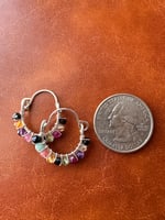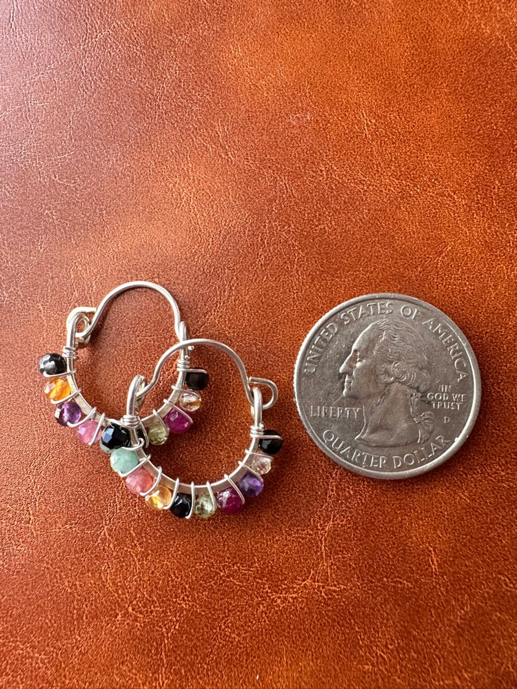 These rainbow hoops bring together a full spectrum of crystal energy. Each stone adds its own layer. Grounding from black agate, fresh growth from peridot, heart support from pink tourmaline, bold action from carnelian, courage from ruby, clarity from amethyst, honest expression from amazonite, and confidence from citrine.
