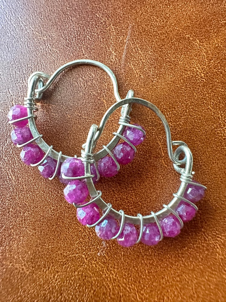 Each Ratna hoop is individually wire-wrapped and hand-hammered in your choice of sterling silver, brass, or copper, making every piece a one-of-a-kind wearable talisman. Ruby carries a depth of red that moves from warm crimson to deep blood red depending on the light, saturated and alive and burning with the kind of beauty that stops people mid-sentence.