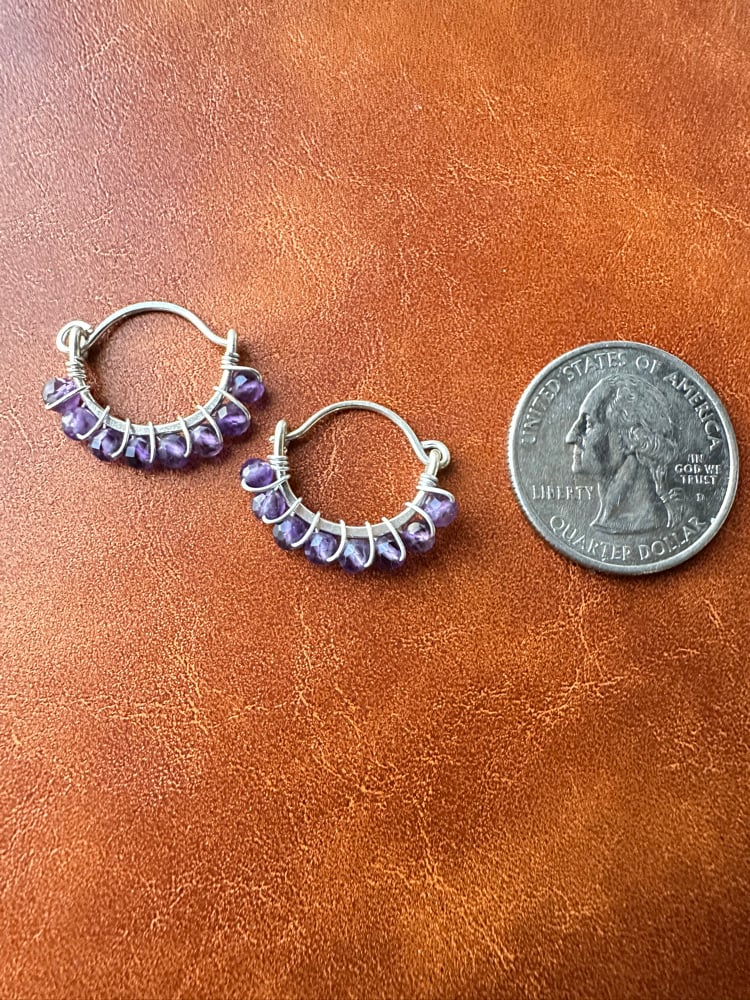 Each Reverie hoop is individually wire-wrapped and hand-hammered in your choice of sterling silver, brass, or copper, making every piece a one-of-a-kind wearable talisman. The deep violet of genuine amethyst shifts with the light, catching moments the way memory does, softly and differently every time you look.