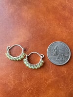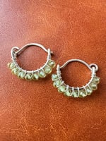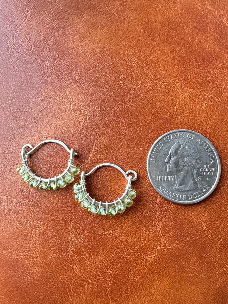 Each Viridian hoop is individually wire-wrapped and hand-hammered in your choice of sterling silver, brass, or copper, making every piece a one-of-a-kind wearable talisman. The vivid yellow-green of peridot is unlike any other stone on earth, warm and alive and luminous in a way that shifts from bright spring green to golden olive depending on the light, always glowing, always present.